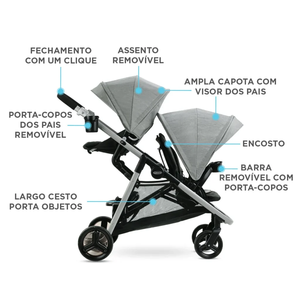 O Graco Ready2Grow LX 2.0 foi pensado para atender às necessidades de mães como você, que precisam de um carrinho funcional e adaptável. Ele conta com dois assentos – um dianteiro reclinável e outro traseiro removível – além de ser compatível com até duas cadeirinhas infantis Graco ao mesmo tempo. Isso é perfeito para gêmeos recém-nascidos! Outros destaques incluem: